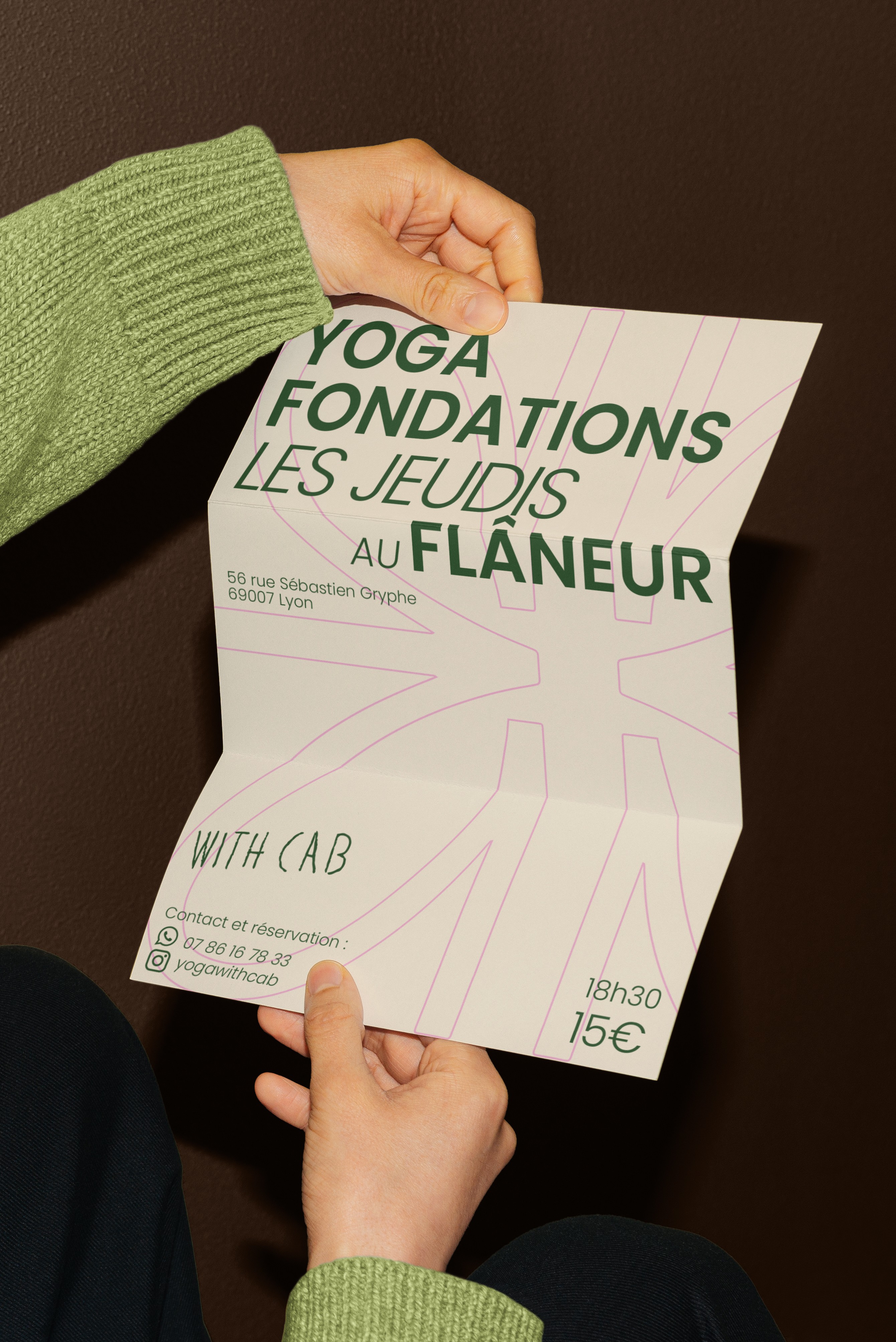Les cours de yoga souffrent souvent d’une image uniforme et parfois trop spirituelle, qui ne parle pas toujours aux jeunes urbains en quête de bien-être concret. Cassandre avait besoin d’un univers qui casse les codes trop “zen” ou épurés, tout en restant harmonieux et professionnel. L’enjeu était de concevoir une identité facile à s’approprier pour la communication sur les réseaux sociaux et la création d’affiches locales.
